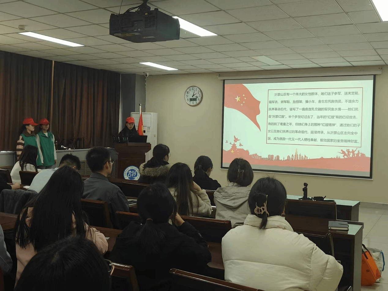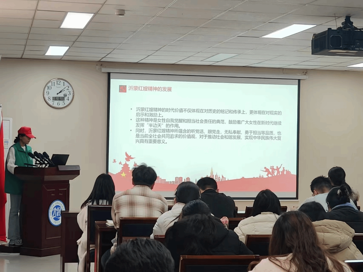 沂蒙红嫂精神是中国革命的象征之一,是无数革命女性的集体光荣称号。在第114个“三八”国际妇女节来临之际,为深入学习贯彻党的二十大精神,传承红色基因,弘扬沂蒙红嫂精神,3月6日,我院研究生第三、第六党支部在地学楼二楼学术报告厅共同开展“传承红色基因,致敬巾帼力量”主题党日活动。本次活动邀请了我院“沂蒙精神”宣讲团成员宣讲“沂蒙红嫂精神”,支部全体党员与积极分子参加。