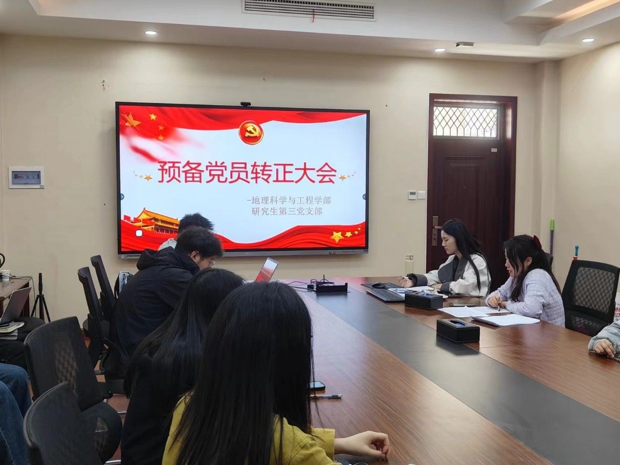 为进一步加强党员队伍建设,不断增强党组织的生机与活力,3月26日,我院研究生第三党支部在地学楼301会议室召开预备党员转正大会。会议由支部书记刘方主持,支部全体党员参加。
