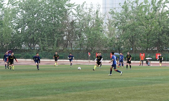 随着裁判的一声哨响,比赛正式开始。淅淅沥沥的小雨,增添了几分寒意,但我院球员们没有丝毫懈怠。上半场比赛我院球员大举进攻,场面稍占优势,但迟迟未取得进球。我院球员薛子成在上半场大放异彩,几次进攻都形成打门,极具威胁;在角球进攻中,薛子成开出的角球,落点、球速、力量都近乎完美,只可惜与进球失之交臂。下半场,双方球员交换场地易边再战。由于上半场体力消耗过大,双方都换了数名球员。下半场我院进攻有所减弱,着力于防守。商学院加强了进攻,好几次威胁到了我方球门,甚至击中门柱。终场前,我院发动了几次进攻,令对手门前风声鹤唳,但遗憾并未转化成进球。最终0:0的比分保持到终场,我院与商学院握手言和。