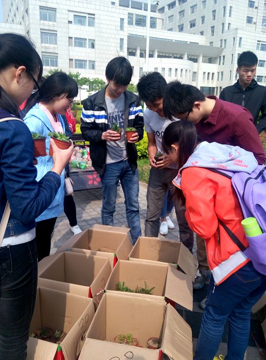 上午九点左右,绿色联盟协会成员已经在摊位上支好帐篷,将用于换购的精美别致的盆栽摆列整齐,等待同学们的到来。活动以30个瓶子换购一个任意盆栽的方式进行。由于这次活动前期有力的线上线下宣传,活动开始没多久,就有不少同学抱着纸箱、或提着大包小包,或拎着塑料袋,将近期积攒的塑料瓶拿来换取自己喜欢的盆栽。时至中午,摊位后大大小小的瓶子就已经堆成了小山。陆续而来的同学越来越多,现场工作人员迎着烈日为每一位同学热情服务。一位骑车带着瓶子前来换购的教育科学学院的同学笑着说道:“早知道有这个活动,这些瓶子也攒了有一段时间了,低碳环保,从我做起嘛。”