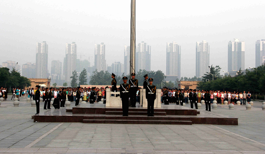 在全体师生的注目礼下,英姿飒爽的国旗班护送鲜艳的五星红旗进场,伴随着庄严的《中华人民共和国国歌》,五星红旗冉冉升起,迎风飘扬。在场的每一个人向国旗行注目礼,深怀对祖国无限的热爱和崇高的敬意。