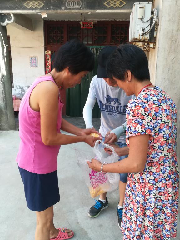 在郑州市温县薛肇村,队员们在一位阿姨家中成功收集到小麦样品,但阿姨家中只有小麦,想要玉米需要重新收集。阿姨了解情况之后,拍了拍胸脯说:“嗨,我以为什么事呢,包在阿姨身上,跟阿姨走!”在阿姨的带领下,队员们在酷暑天气里挨家挨户地询问,直到第五家才找到了玉米样品,阿姨在帮我们找齐样品后,才与我们告别。