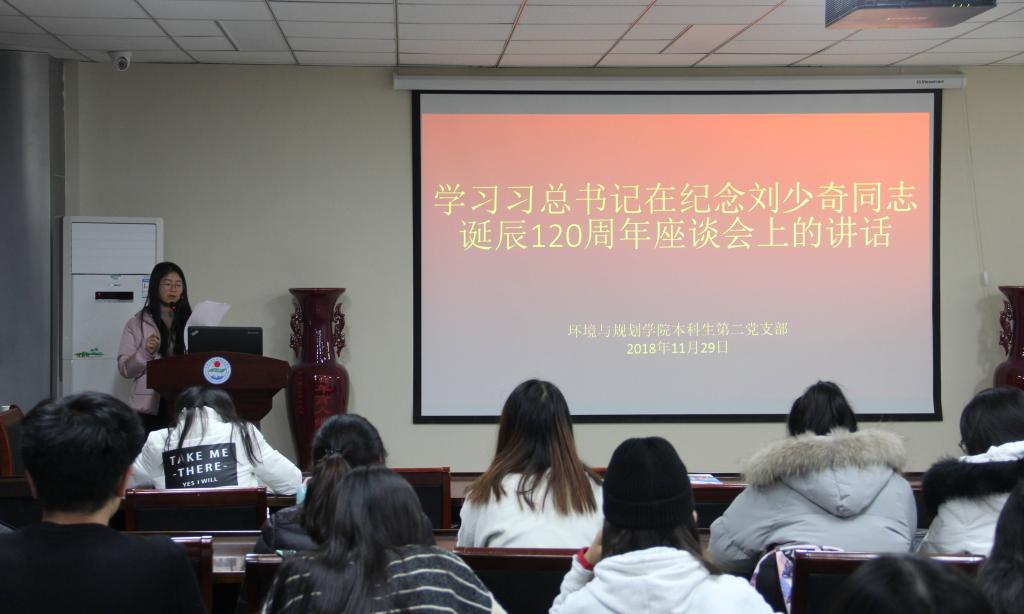 为纪念刘少奇同志诞辰120周年,学习、继承和发扬刘少奇同志的崇高品德和精神风范,11月29日下午,环境与规划学院本科生第二党支部在学院二楼报告厅学习习近平总书记在纪念刘少奇同志诞辰120周年座谈会上的讲话精神,开展以“学榜样 强信仰 勇担当”为主题的党日活动。支部全体党员及入党积极分子参加本次活动。