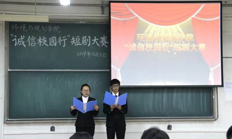 为培养学生诚实守信、知恩感恩、自立自强的优秀品质,125日下午,环境与规划学院在金明综合楼4101举办了以“诚信筑未来,奋进新时代”为主题的“诚信校园行”短剧大赛。