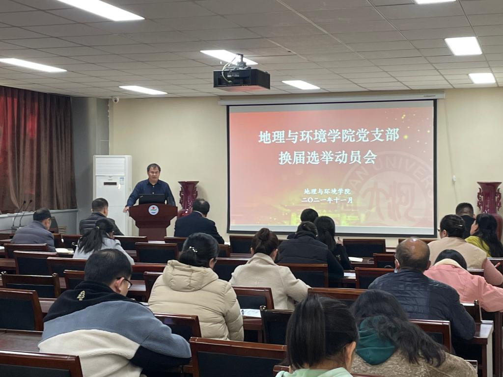 2021年11月11日下午,地理与环境学院在二楼报告厅召开党支部换届选举动员会,由学院党委书记郑洪涛主持。
