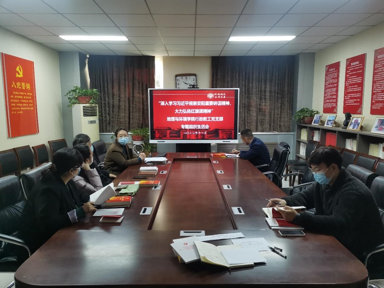 为深入学习贯彻习近平总书记视察安阳重要讲话精神,弘扬落实自力更生、艰苦创业、团结协作、无私奉献的红旗渠精神,赓续红色血脉,增强全体党员的使命感与责任感,11月21日,我院行政教工党支部在党员活动室开展以"深入学习习近平视察安阳重要讲话精神,大力弘扬红旗渠精神"为主题的专题组织生活会,学院行政副院长邱永宽同志以普通党员身份参加会议。