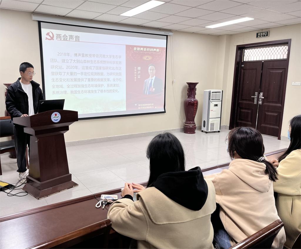 活动伊始,由白玉龙、李玉靖、乔雅琦、胡沁雨四位支部党员组成的学习小组,带领全体党员深入学习了2023年全国两会期间习近平总书记发表的重要讲话精神及全国两会精神,鼓励支部党员将两会精神落实到日常学习工作中,争做学习宣传贯彻两会精神的践行者,积极发挥党员先锋模范作用,在年级各专业及学院中迅速掀起两会精神学习热潮。其中,白玉龙同志还分享了全国政协委员、我院院长傅声雷教授在“两会”中发出的河大声音,傅声雷教授提交的《关于如何深化体制机制改革以提升科技创新能力的提案》聚焦科研教育,提出“摒弃单一量化的科研评价方式,对于不同定位的科研机构应区别对待,避免一把尺子量遍所有科研机构”。