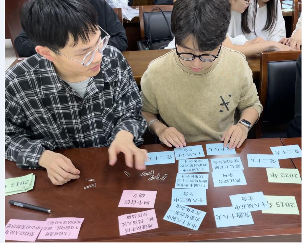 第二环节开展“拼接知识碎片”趣味游戏。游戏开始,学习小组成员段园凯介绍游戏规则,本次趣味游戏准备了三类“知识卡片”:第一类卡片上写着不同的习近平新时代中国特色社会主义思想具体内容;第二类为其对应提出的时间;第三类为提出的会议名称。每组成员需要完成知识卡片的拼接,限时5分钟,在规定时间将三种卡片拼接正确最多的小组获胜。游戏过程中,同学们积极答题,气氛紧张而热烈。游戏结束后,学习小组成员现场对答题结果进行统计,第四小组获一等奖,第七小组获二等奖,第八小组获三等奖。随后,党支部支委为在游戏中表现优秀的小组颁发奖品。