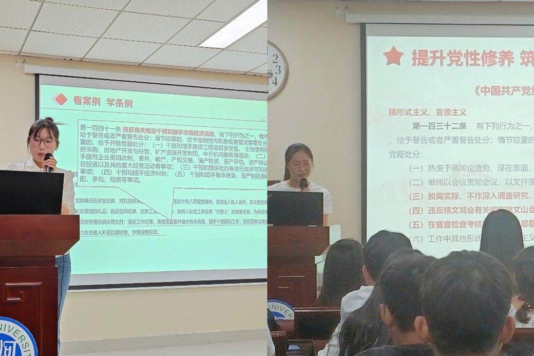 会议开始,由刘媛同志和孔悦同志先后以《自觉锤炼党性,激扬青春力量》和《严守纪律底线,砥砺担当作为》为主题带领全体成员学习。刘媛同志对《条例》修订的背景、要点及主要内容和实施细则进行了深入浅出的解读和阐述,同时列举并解析了多项违反《条例》的案例,强调党员同志们要从全面从严治党的政治高度重视《条例》的学习。孔悦同志在此基础上阐述《条例》修订的意义,并且着重强调作为党员我们必须要有高度的政治觉悟,始终把纪律和规矩挺在前面,严格遵守党章党规党纪。同时,每一位党员都要增强担当意识,勇于挑重担,敢于锤炼自己、磨砺自己。