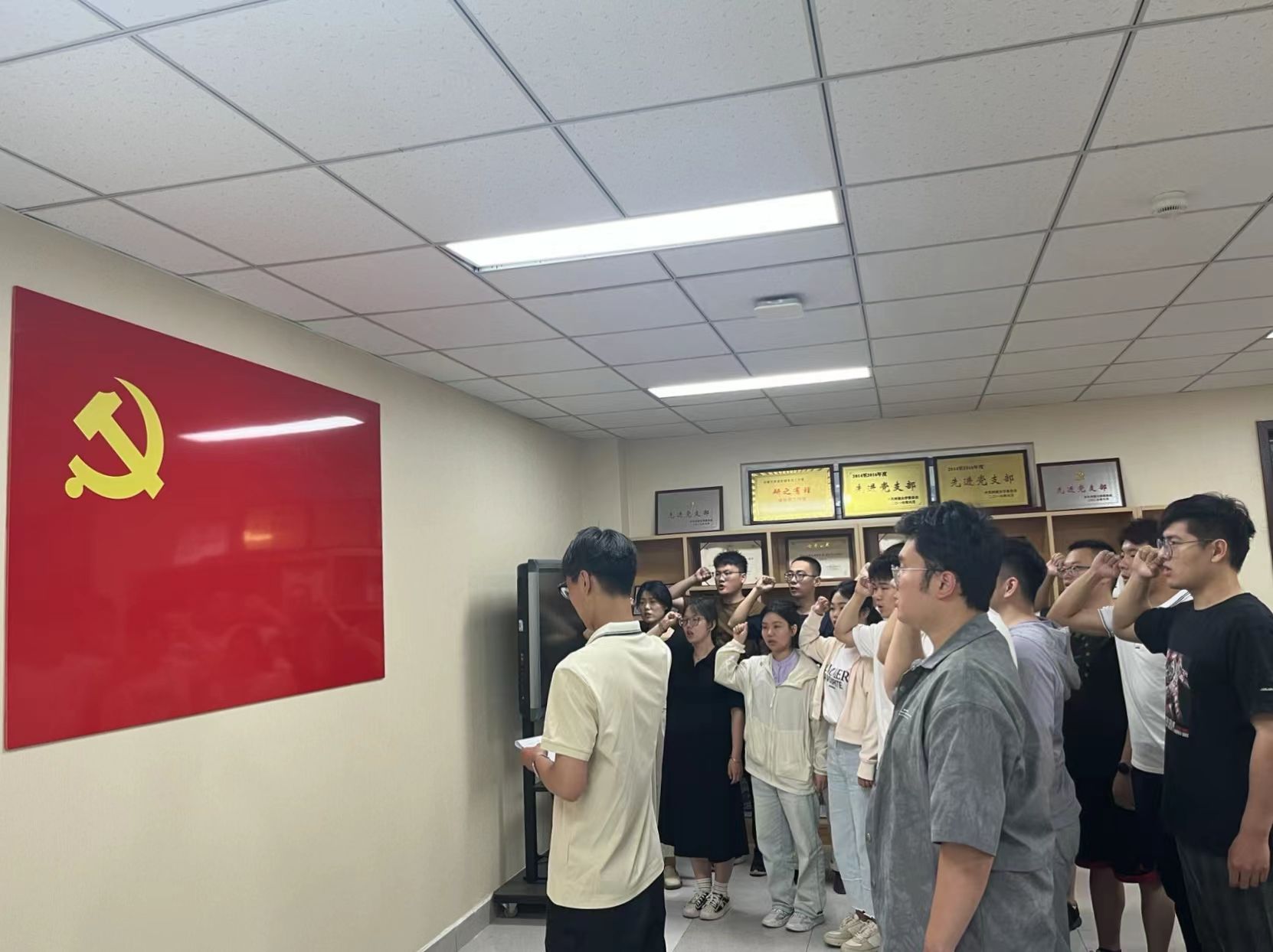 会议最后一项,王劲草等十八位同志在支部书记史靓潇同志的带领下,面对党旗郑重宣誓!至此,十八位发展对象正式成为光荣的预备党员。希望十八名同志能够坚定自己的理想信念,在为共产主义事业奋斗的路上不断升华自身!