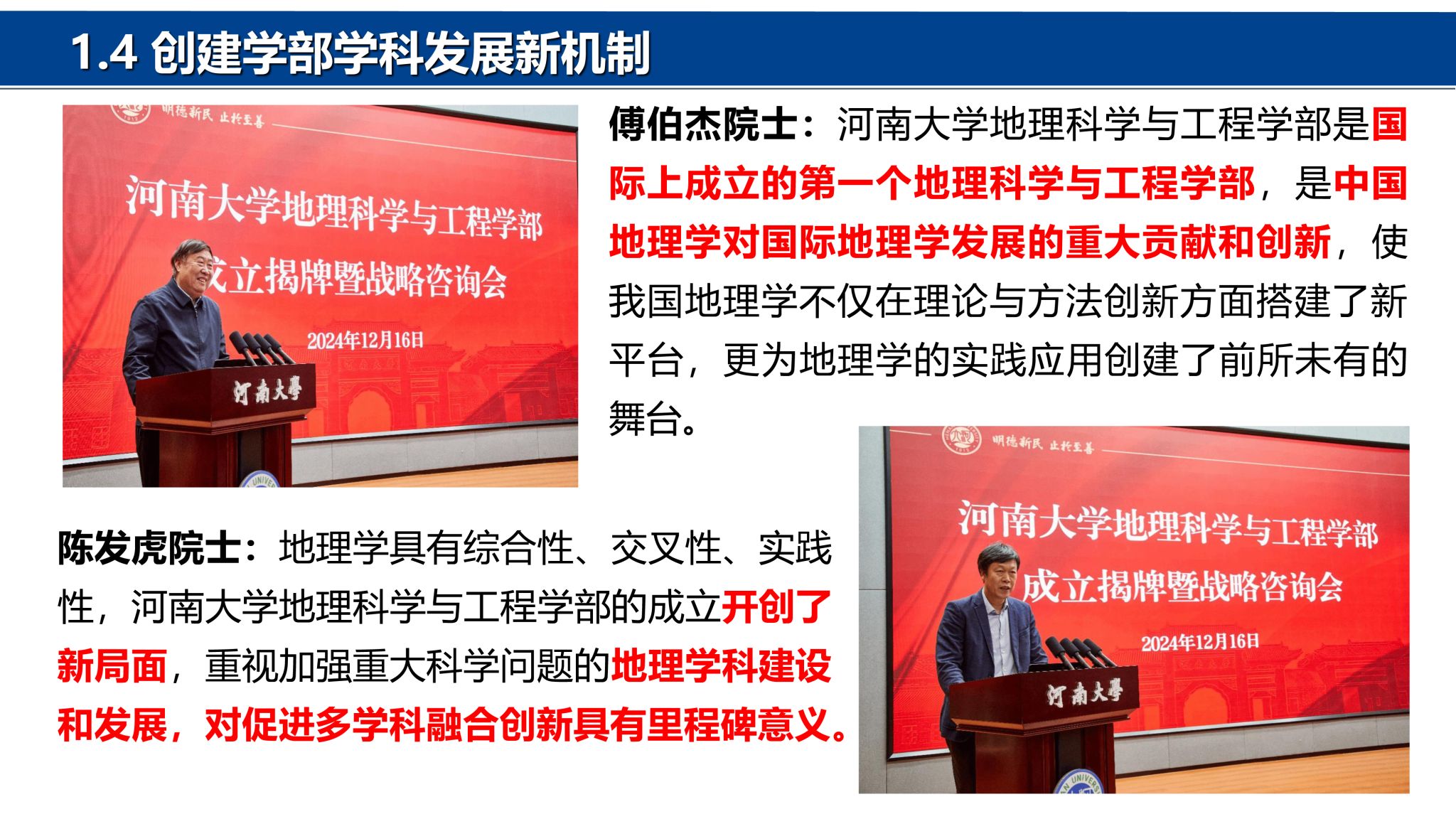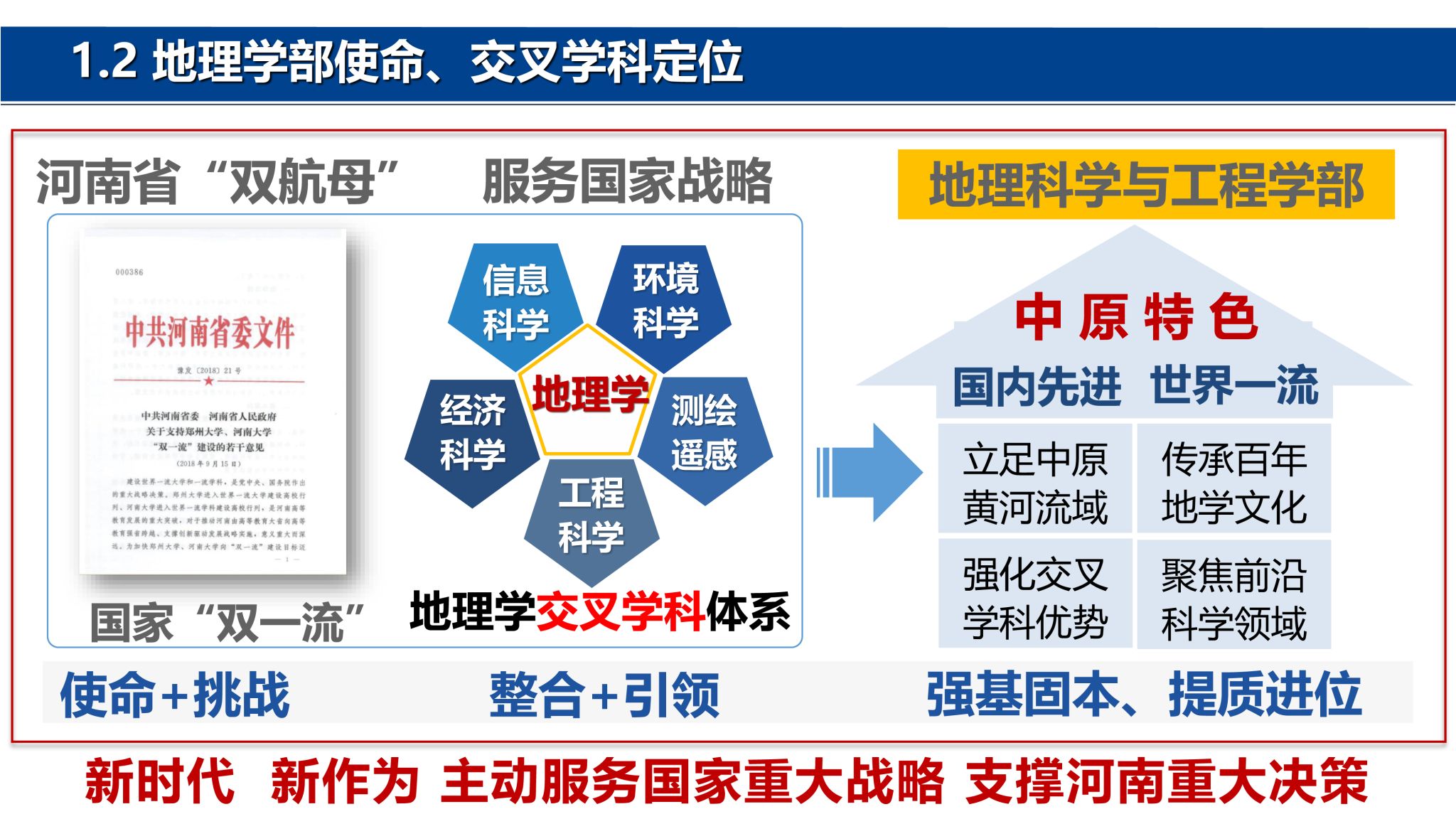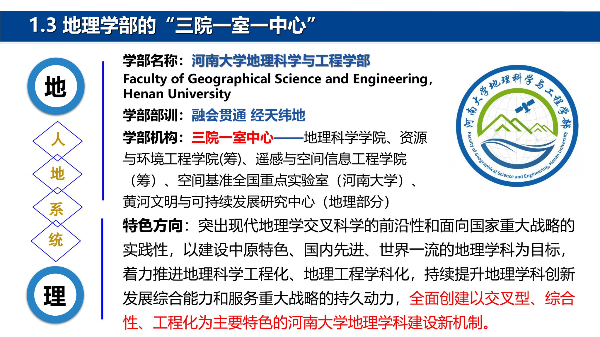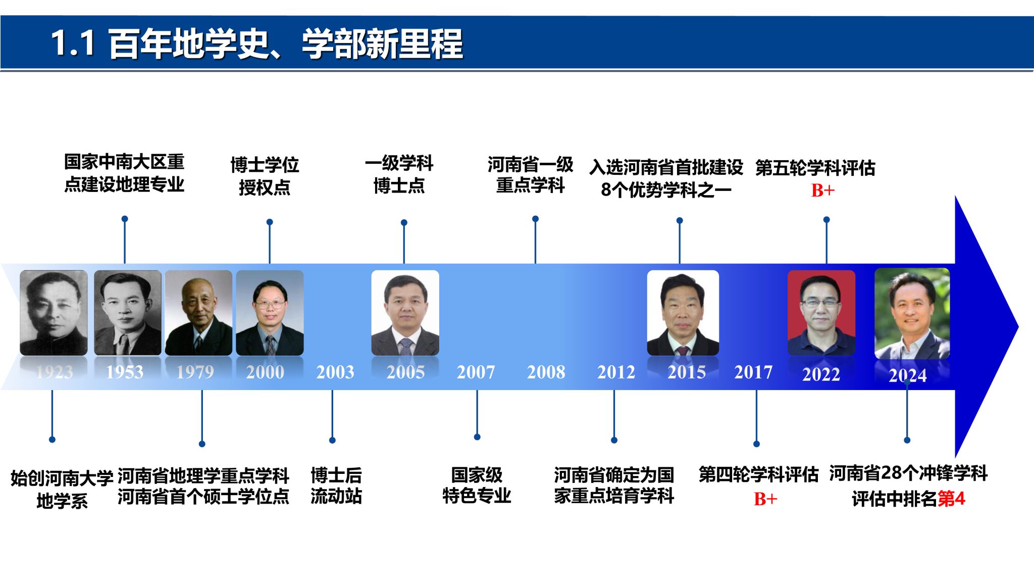前身)的地学系,首任系主任为著名地学家、中国科学院学部委员(中国科学院院士)冯景兰教授。经过几代地理人的筚路蓝缕、奋力拼搏,地理科学与工程学部在教学科研、学科建设、人才培养、社会服务等方面取得了突出的成绩,得到社会各界一致赞誉。地理学科在国家第四、第五轮学科评估中为B+位次,2024年在河南省28个冲锋学科评估中排名第4。