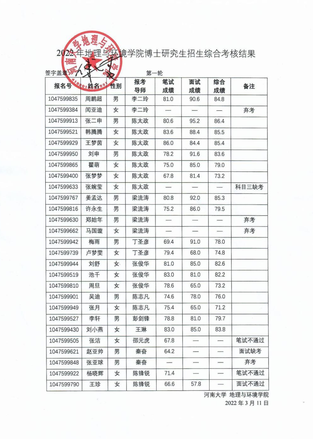 2022年地理与环境学院博士研究生招生综合考核结果-第一轮